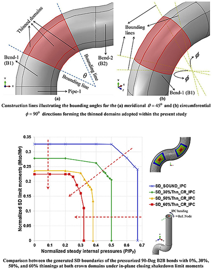 This research studies the effect of wall thinning on generated shakedown (SD) interaction diagrams of pressurized low-carbon steel 90-degree (90-Deg) back-to-back (B2B) bends. More precisely, the SD limit moments are determined for various steady internal pressure spectra thus generating the targeted SD boundaries. The SD limit moments are computed utilizing a direct non-cyclic technique termed